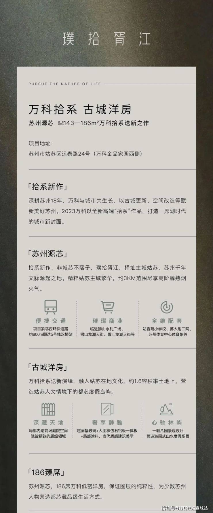 主城姑苏臻品洋房,启见当代世家门第。万科·璞拾胥江,仅186席限量隐奢洋房,一席一姓氏,层峯人物相会,典藏一个圈层的臻贵生活。