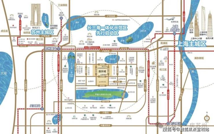 苏州南站(汾湖站)位于长三角一体化先启区——汾湖,沪苏湖铁路、通苏嘉甬城际高铁于此呈“十字”交汇,其中沪苏湖铁路由上海虹桥枢纽引出,途经上海松江、苏州吴江,至浙江湖州站,通车后将实现由汾湖8分钟到松江,20分钟到达上海虹桥枢纽,将汾湖与上海更紧密的联系在一起。
