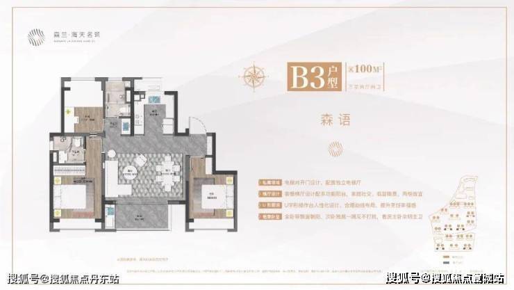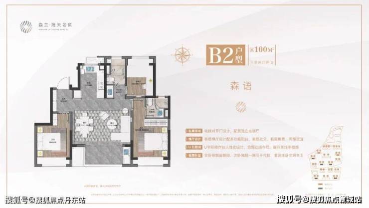 1、建面约100㎡三房两厅两卫,市场主流户型。客餐横厅设计配多功能阳台,优势在于更大采光面和更好通风效果,把过道纳入到客厅和餐厅的空间中来,使整体空间得到更好的利用。