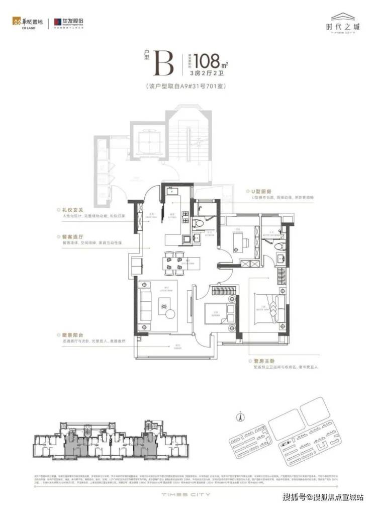 建筑面积约108㎡三房两厅二卫,采用了该面积段少有的大面宽客餐厅+大阳台的配置,整体3.5开间朝南,阳光满溢。
