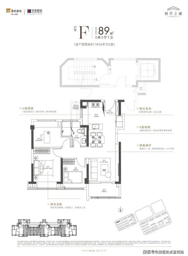 建筑面积约89㎡3室2厅1卫,客餐厅一体,南连景观阳台,诠释时代人物的居住风范。