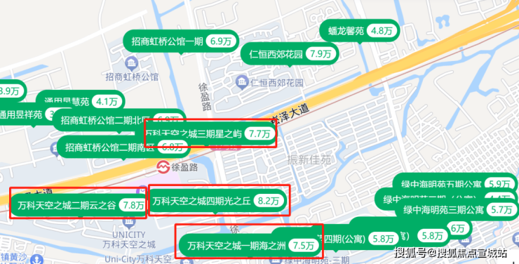 在大虹桥,TOD新盘万科天空之城的挂牌价格在7.5-8.2万/㎡之间,甚至突破了区域多年的标杆豪宅选手仁恒西郊花园,持续保持高位: