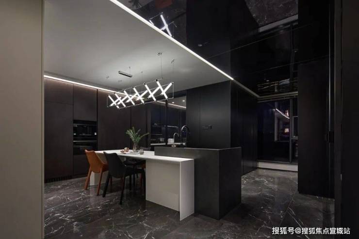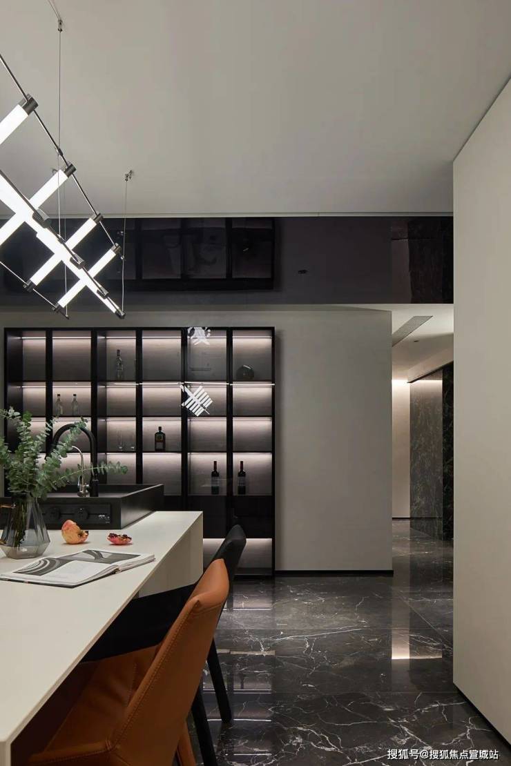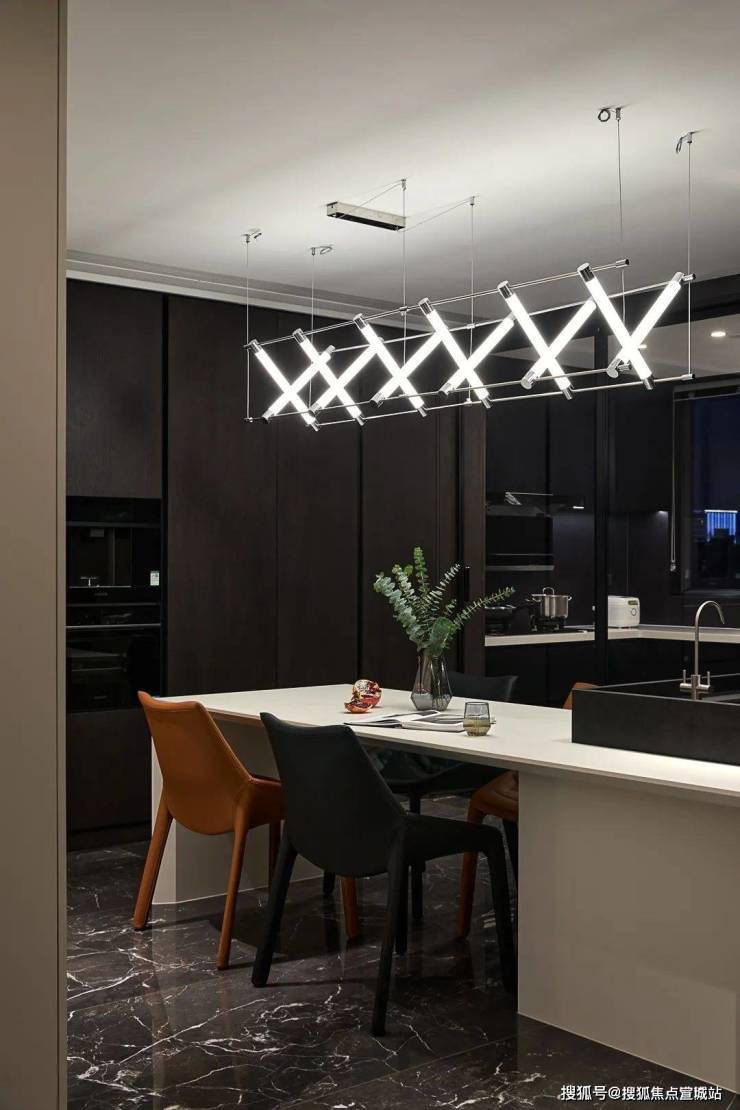 与客厅相比,餐厅对黑色的运用更为多元。设计师巧妙地运用不同材质,吊灯与精致器皿相得益彰,一幅城市墨画定格了时间,伴随着富有格调的三餐四季。