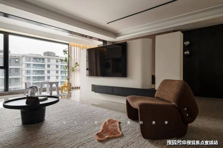 重新设计后打破原本结构,把鞋柜和次卧门与沙发背景连成一体,更简洁大气