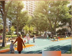 292、效果图:一种表现建筑外立面、小区景观等的平面图片。