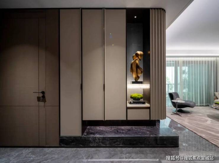 入户门选用了拉丝金属的门套、飞利浦(或同档次品牌,下同)智能门锁,温润透光石的壁龛,扑面而来是厚重的安全感和尊崇体验。户玄关处打造了一排顶天立地的玄关柜,多功能收纳组合柜(除臭烘干机+灵活储物空间),收纳空间非常充足。