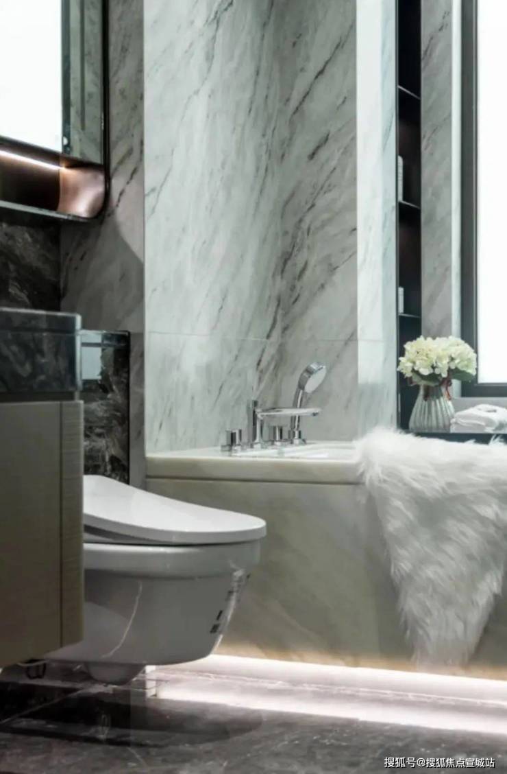 主客卫统一采用德国唯宝的悬挂式洁具,底部空间悬空不易藏污纳垢,冲水按钮设置洁具侧面墙上,伸手即可一键冲水,尽显金茂府3.0对人居更深层次的理解。