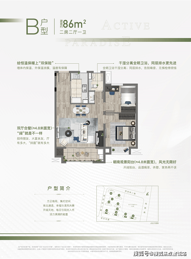主力户型建面约86平两房两厅一卫