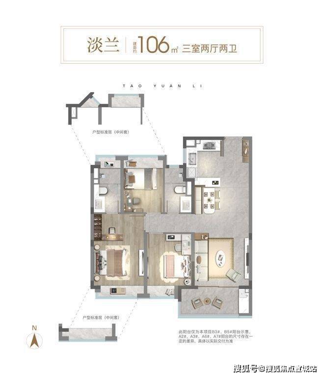 建面约106㎡,得房率高达约78%,做到了真正的正三房空间,客厅面宽达到约3.45米,开放式可视厨房设计,搭配南向大面积阳台,打造开阔的一体化家庭公共活动空间,整体居住体验明亮开阔。
