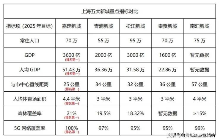 再看未来规划,在已经公布的五大新城2025目标中,嘉定不仅在GDP领域依然遥遥领先!甚至在森林覆盖率、人均体育场面积,甚至5G网络覆盖率等发展指标方面均稳居第一!强大的经济实力、规模化的产业体系会带来人口的加速导入和城市硬件的快速更新!