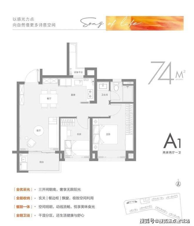 建面约74㎡2房竟做到三开间朝南,其中两卧均朝南,同时面宽甚至大于进深,这比同类产品卧室一南一北狭长布局要舒适得多。