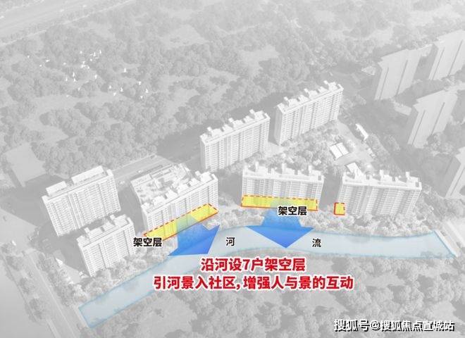 项目南向临河,为了更好发挥水岸优势,沿河设7户架空层,把河景最大程度引入社区。