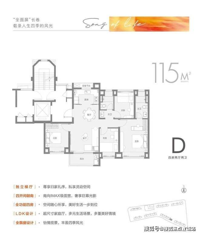 建面约115㎡4房做到同面积段罕见的四开间朝南+4房设计,同时能以更经济的总价一步到位4房。