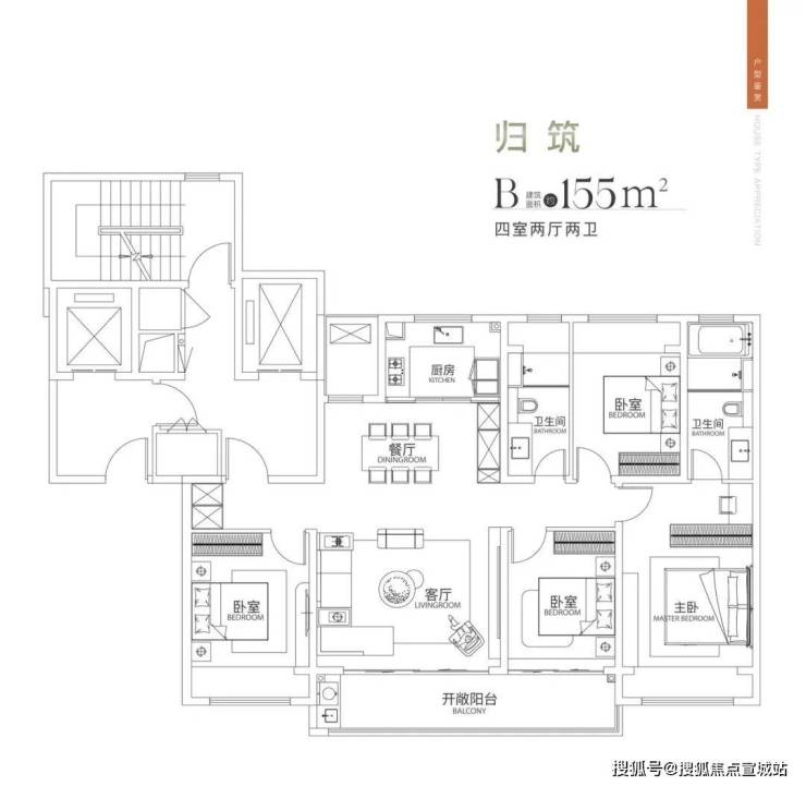 183户型为2梯2户设计,做了4房2厅3卫,含2个套房。户型方正,没有空间浪费;四开间朝南,南向面宽达16.3米,客厅开间6米,阳台宽9米;入户有玄关,预留了家政间空间;餐厨区南北向连,与客厅保持恰当的距离;主卧套房面积约32.6㎡,卫生间含双台盆、淋浴和浴缸;次卧套房面积也不小,但是为暗卫。