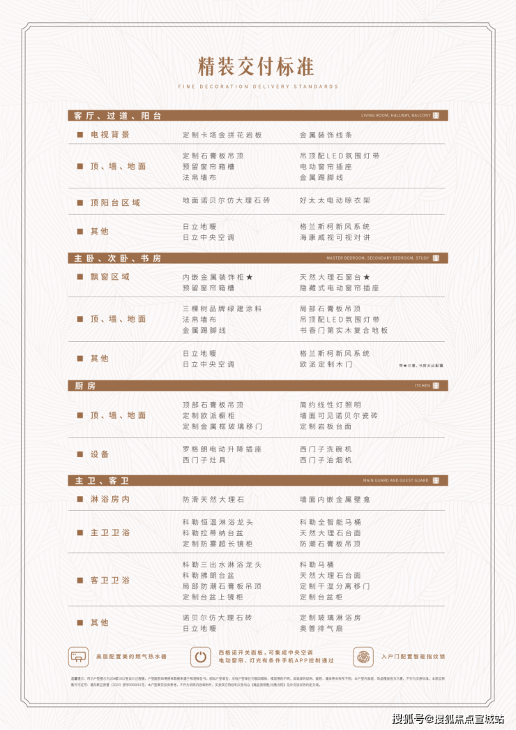 项目装修标准也是诚意满满,中央空调、地暖、新风系统“三大件”配齐,厨房、卫浴也有不少细节交付标准。