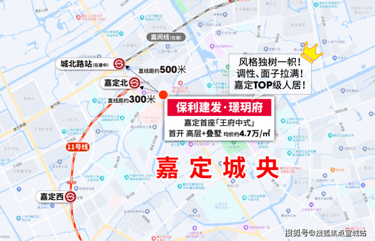 保利建发·璟玥府,直线距离11号线嘉定北站约300米,直线距离嘉闵线城北路站(在建中)约500米,不仅是真正的轨交盘,而且是双轨交盘!
