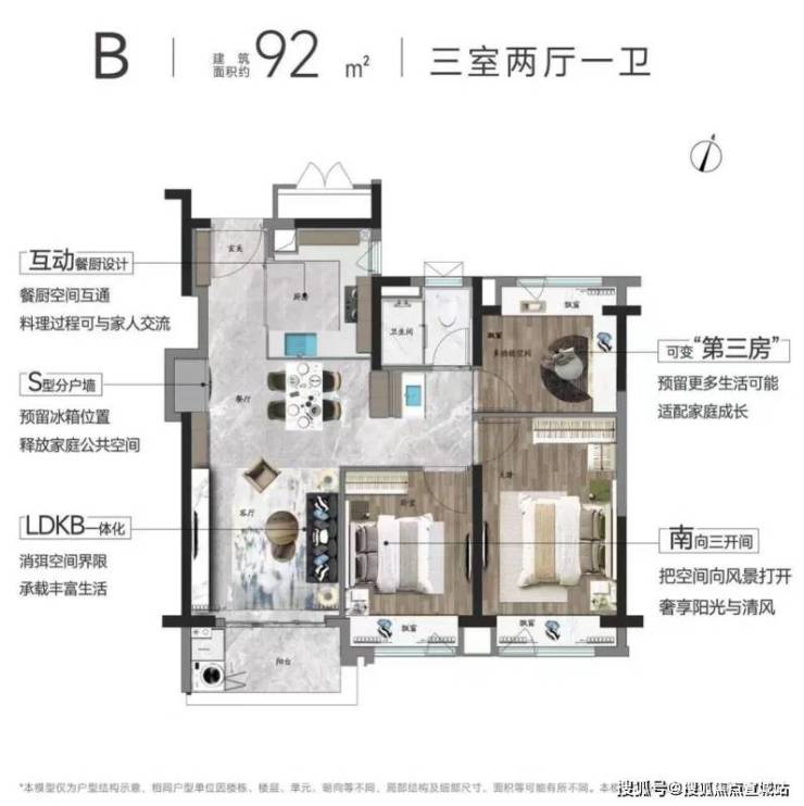 目前,朗拾花语在售的主力产品为建筑面积约92㎡房源和建筑面积约95㎡房源。其中,建筑面积约92㎡户型毛坯房源可实现创新三房变两房的设计,打造百平内约6m大横厅,30㎡的客厅创造150㎡大宅的厅堂尺度,LDK一体化、一体主卧套房设计等等,空间感与收纳感更是让人惊艳,无可挑剔。