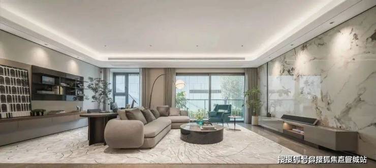 最高达到约7.8米的客厅面宽,配置整块的电视机背景墙,无主灯设计、隐藏射灯营造的氛围感,符合时尚潮流审美。