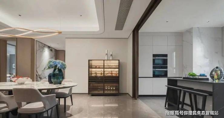 厨房玻璃门是上轨道移门,意味着地面部分没有任何轨道,不会有灰尘积攒,炒菜时关上,避免油烟散入室内;平时拉开,可以扩充室内视觉感受。