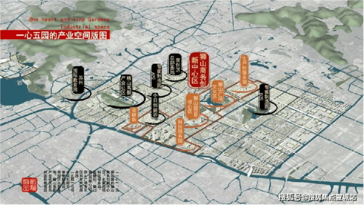 ◆一心:狮山商务创新中心区——自西向东由狮山路CBD核心区、狮山广场文化区等产业区域构成。
