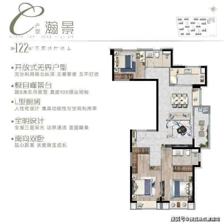 120平米双面宽版开放式交友户型,大尺寸景观阳台直面东侧地标,主客卧分开,保障隐私。