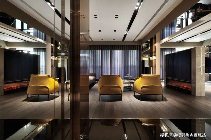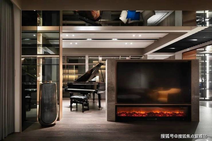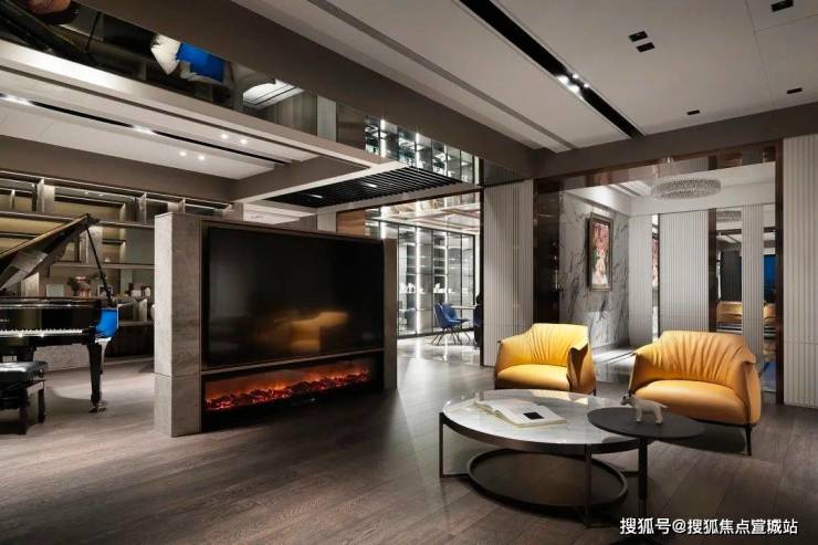 客厅、交谊厅、餐厅融会贯通,展现豪宅气势;大理石电视墙伫立于客厅与交谊厅之间,起到隔断作用,下方搭配壁炉设计,冷暖平衡。