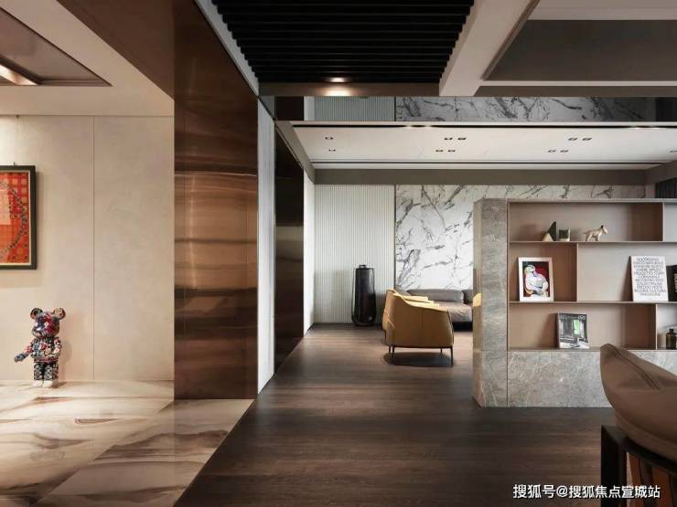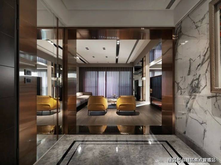 玄关以白色大理石妆点墙面,灰色石材辅以黑色大理石围边的细腻巧思,营造美学层次。