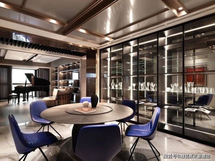 餐厅地坪铺设纹理强烈的进口砖,呼应整体奢华、时尚调性。