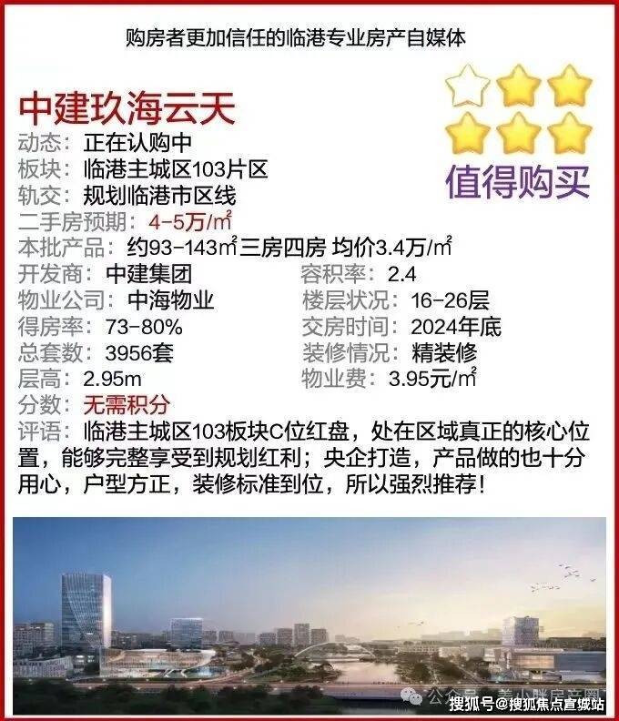 中建玖海云天售楼处营销中心☎☎:400-8123-224✔✔位于临港自贸区 103 顶科社区核心位置,海港大道与美人蕉路交叉口 。项目由世界 500 强第 13 位的央企中建打造,总建面约 70 万方(含联合研发中心),容积率约 2.4,绿化率约 35%。主推建面约 93-160㎡的 3-4 房,均价约 3.4 万 /㎡,总价 293 万起。