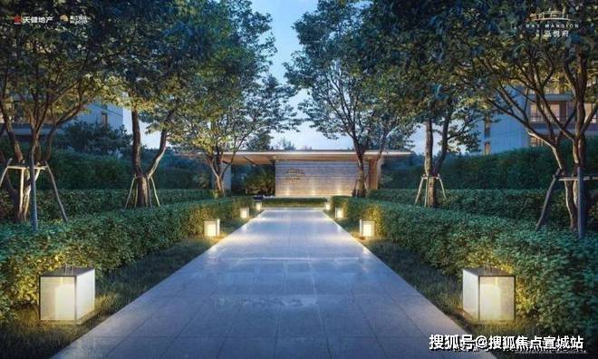 项目打造了南北双酒店式入户大堂,金属质感的造型景墙,配上璀璨的氛围灯,小区中轴曲水流觞,归家仪式感十足。