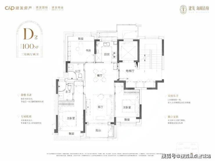 建面约103㎡3房户型:比起市面上普遍的三开间朝南动静分区户型,建发·海阅首府该户型至少有3大爆点: