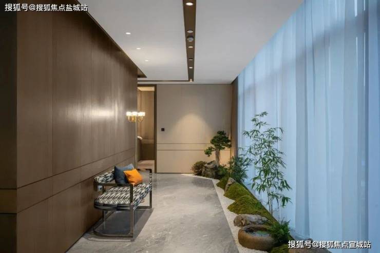室内还有更精妙之处。潮上中南银座的每套房源,都设计了一条7米多长、3米宽的室内艺术廊道。加藤精心挑选棕竹、铁线蕨,规置手水钵、石灯笼和苔山。