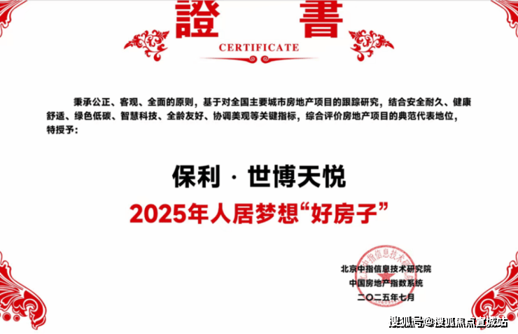 2025年,中指研究院在全国范围内优选出100个『2025年人居梦想“好房子”』项目。保利·世博天悦成功入选。