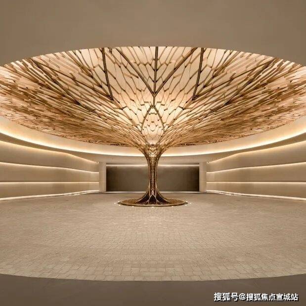 陶砚176㎡户型:取陶砚之自然璞实感,雕琢白冰玉的背景墙,客厅吊顶还原砚台造型,室内饰以瘦金体笔划装饰线条。