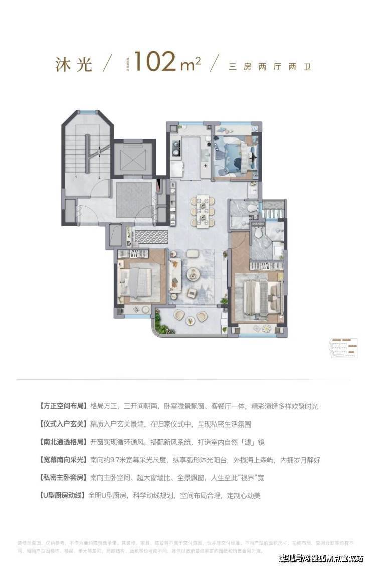 南北通透三开间朝南,主卧套卫设计,99㎡的空间却能实现传统95㎡无法比拟的舒适度,真正做到了小面积大享受!