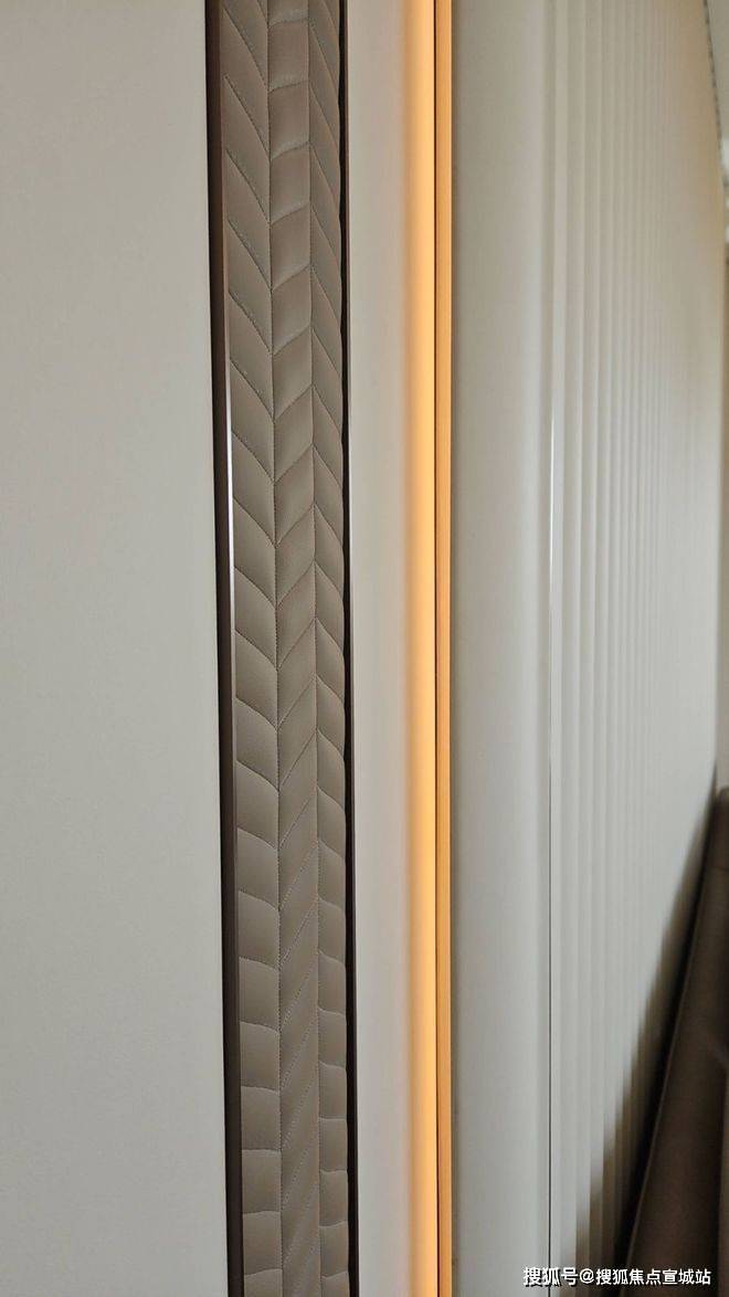 我们来看墙体的细节处,墙面同样做了层叠设计,从侧面看,立体感明显。石材墙面开槽,镶嵌有金属条点缀,注意,这样的点缀条,也做了弧形处理。宝华紫薇之星售楼处电话:400--8862-334☑️☑️