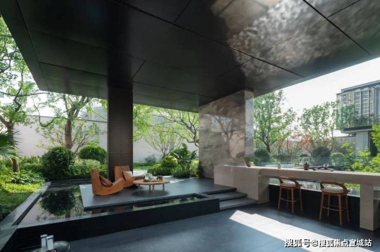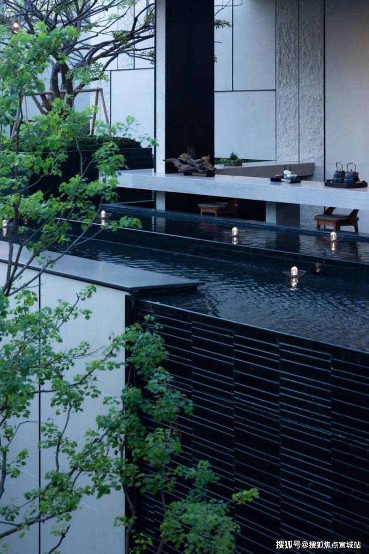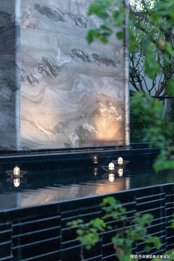 将紫气东来(奢石)运用到水幕景墙上,赋予了整个空间的隐逸高级的诗意,质朴中的奢华