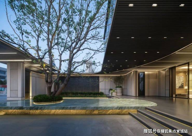 约40米奢阔归家门庭,历经近30版建筑方案反复修改,60版细节比例研究精筑,奢选精致石材搭配金铝板,营造归家雅序。