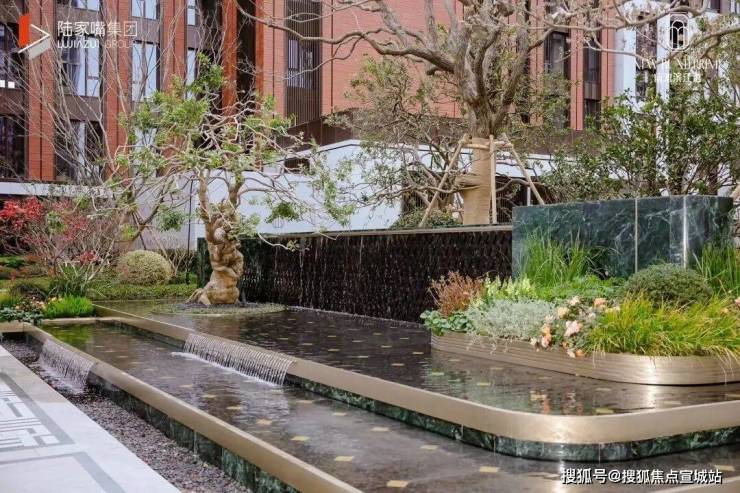 园中的两处水景各有特色,浮岛花园水面铺就华尔道夫同款幻影蓝石材,阳光洒落,泛起细碎蓝色光芒;普拉达绿石材立面与叠水工艺相衬,滨水的灵动扑面而来。