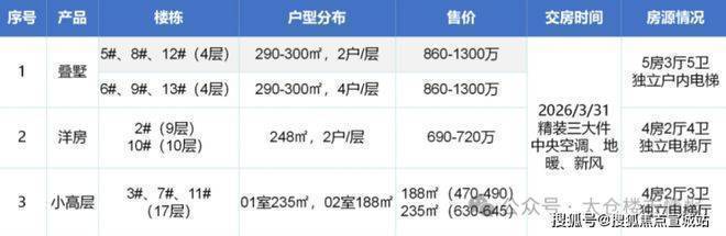 洋房大平层:户型建面在 188 - 248㎡,以四居、五居为主,单价区间 2.5 万 - 2.85 万 /㎡,总价约 470 - 1300 万 / 套。该户型得房率达 87.5%,采用四开间朝南设计,配备全景落地窗,部分户型有 270° 环幕视野,还包含客餐一体化设计等亮点。
