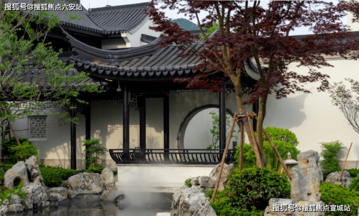 江南园林甲天下,苏州园林甲江南,比如像我们现在看到的园林布局,就是经典的苏州园林景观,讲究引水入园。造景围绕着这片水景展开,空间上比较有层次感。近景是流水、堆石,中景是连廊、假山,远景是中式合院的院墙、屋檐。