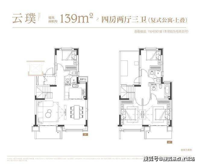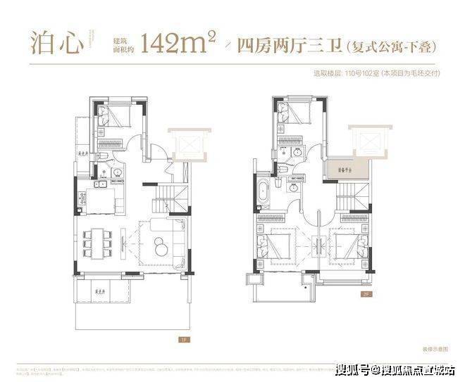 叠墅:叠墅一共四层,分为上/下叠,上叠建筑面积约139㎡,下叠建筑面积约142㎡。