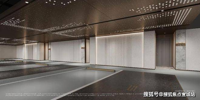 汽车坡道采用氛围照明,搭配星空顶造型彰显独特。玄关空间以线条灯光、地面环氧磨石、星空顶及柱面石材等,提升业主归家仪式感及空间品质感。