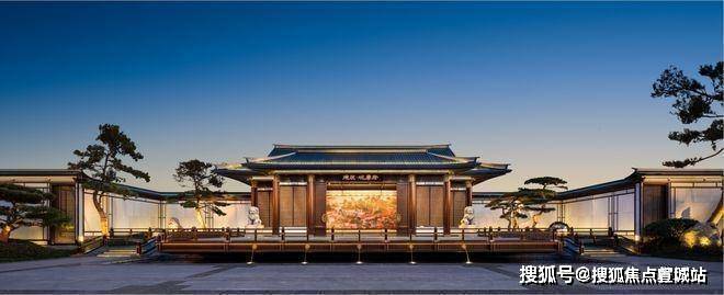 入境观唐,尺度威仪的唐风大门,面宽约40米,高约9.6米,屋顶采用“重檐歇山顶”形式,彰显中式门第尊崇之礼。