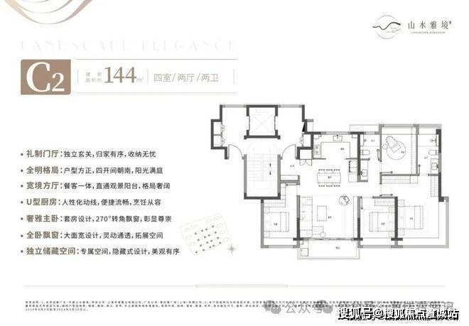 户型特色:三开间朝南、U型厨房、全屋飘窗、动静分区、主卧套房、双卫设计等。