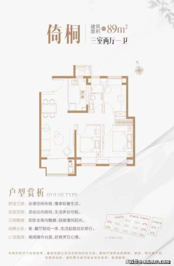 89㎡户型:三室两厅一卫,三开间朝南,南北通透,空间利用率高。
