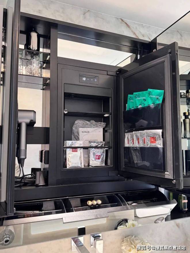 同时,专为美妆用品设计的分区收纳,无论大小物品都能有序存放。主卫还配备了与镜柜一体化的美妆冰箱,无需外接插座,温度可调,专为护肤品和化妆品提供理想的存储环境。