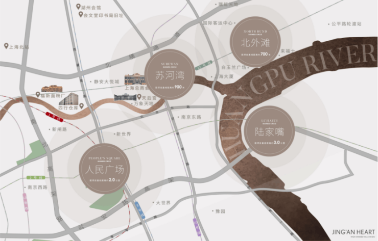 ●约4km内黄金商圈腹地,距离人民广场商圈约2km、南京西路商圈约2km、陆家嘴商圈约3km、静安寺商圈约4km。