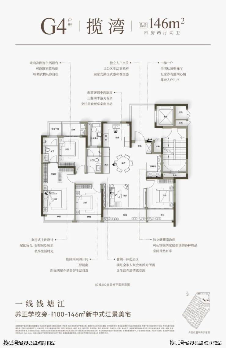 建面约146㎡则分为横竖两款,全部一线朝江。两梯两户,都有独立电梯厅。“横版”是四开间朝南+大方厅,“竖版”有大边厅+超长转角飘窗的“全景舱主卧”。