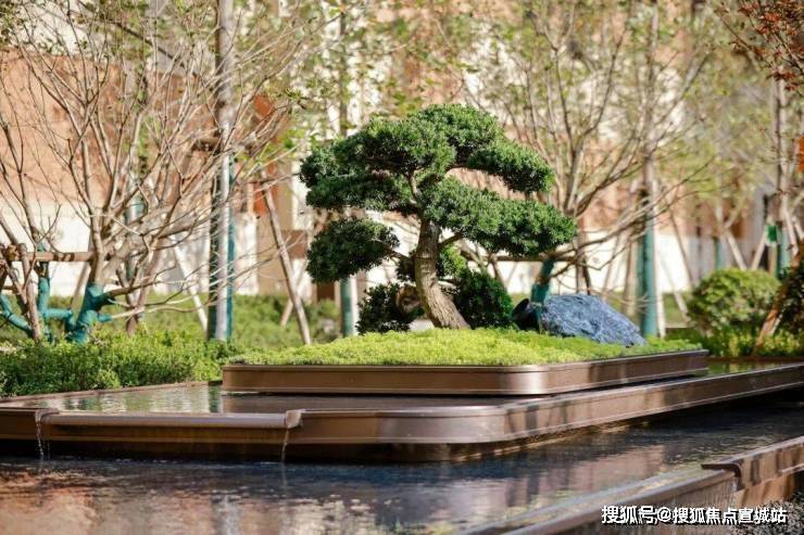 月光庭、浮光庭叠水潺潺,乔木掩映,层次感突出,营造出则繁华、入则静谧的度假式生活。